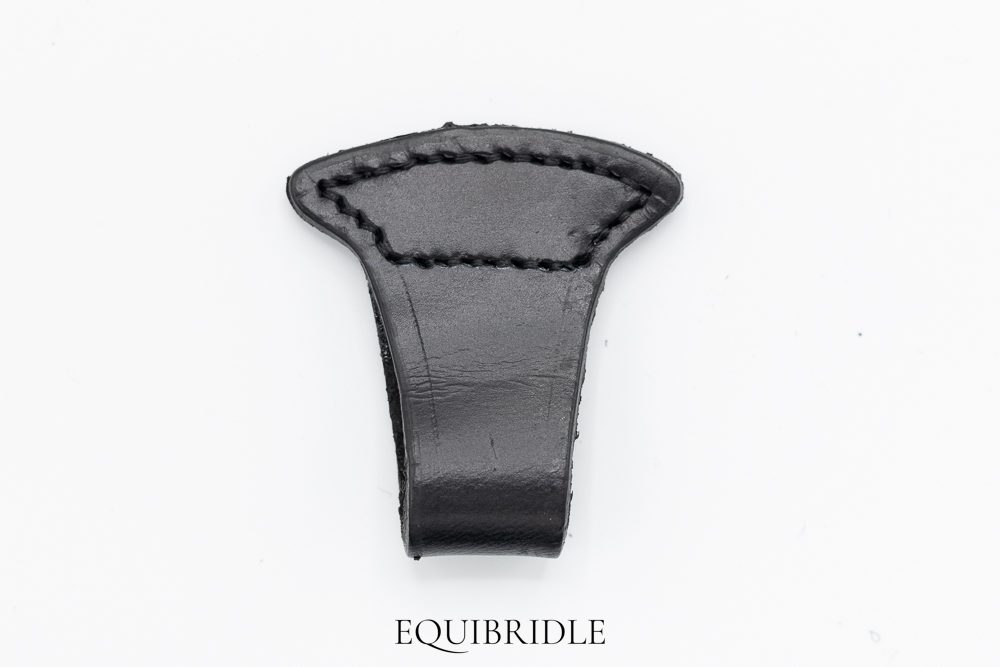 Dit lusje schuif je via de bovenzijde van de neusriem tussen de padding en het leder. De bovenkant van de lus blijft vanzelf achter het stiksel hangen. Om het lusje te verwijderen druk je hem naar boven en haal je hem via de bovenzijde er weer uit.