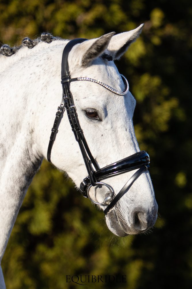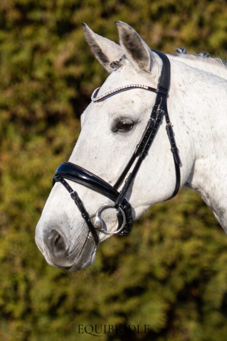De taps toelopende gecombineerde neusriem in zwart lakleder is speciaal gevormd om meer ruimte te geven bij het bit en druk op de jukbeenderen en uittredende zenuwbundel te vermijden. Dankzij de iets hogere ligging blijft ook het gebied rond de kiezen vrij, wat veel paarden als prettig ervaren.