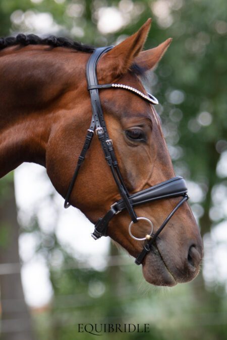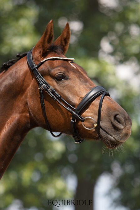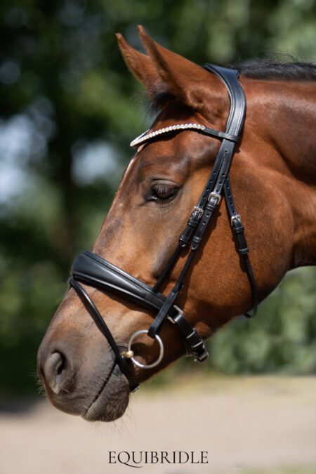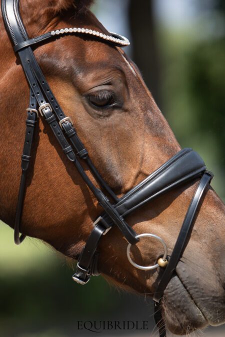 - Recht kopstuk – Sommige paarden hebben een erg ongelijkheid in bespiering achter de oren. Een anatomisch kopstuk is dan niet geschikt doordat deze bij ongelijke bespiering ook ongelijke druk geeft. Vaak waardeert het paard een normaal recht kopstuk dan het meest. Ook dit kopstuk is onderlegd met super soft leder.