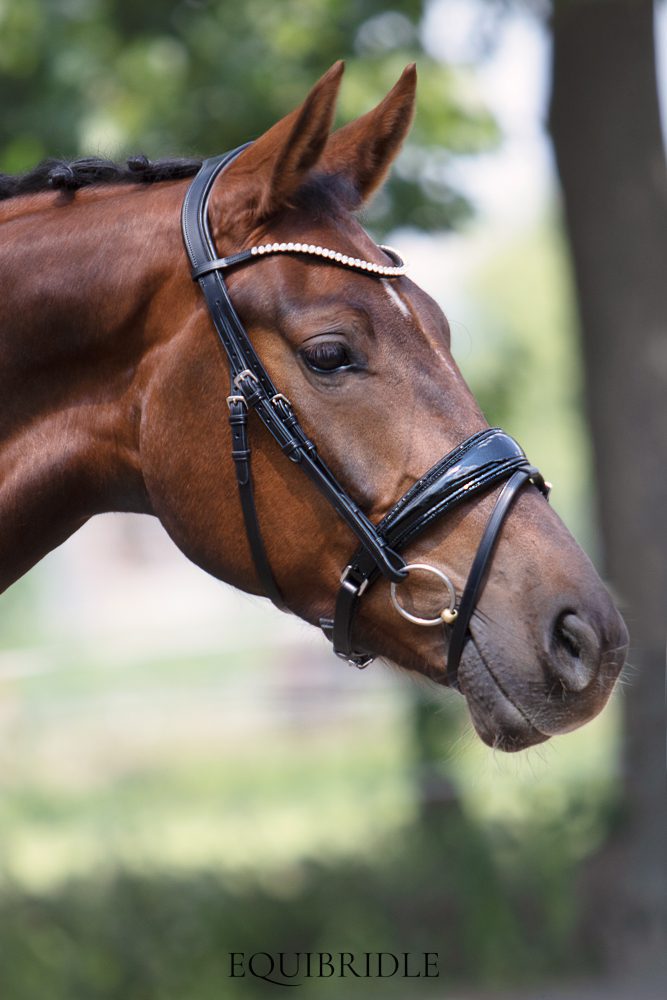 Zeer luxe anatomisch hoofdstel van soepel zwart Europees leder, met een speciaal gevormde lak neusriem afgewerkt met een subtiele bies van zwarte glittersteentjes. De neusriem is taps toelopend en onderlegd met super soft leder voor maximaal comfort en ruimte rond het bit.