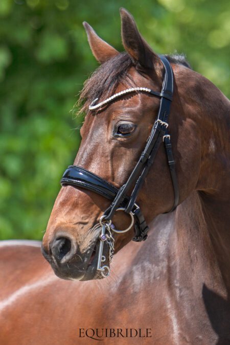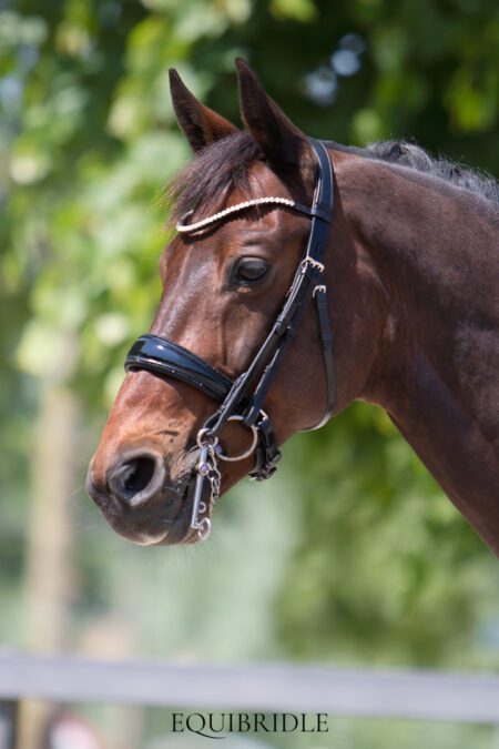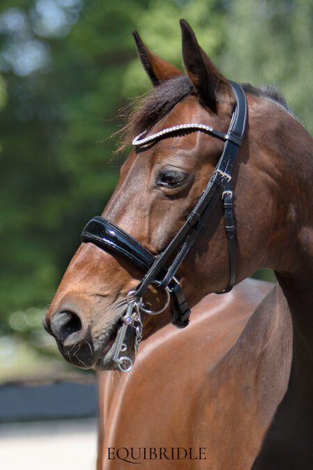 - Speciaal gevormde hoge neusriem, deze loopt taps toe zodat er ruimte is voor de bitten en voor de uitredende zenuw boven de neusriem. Daarnaast is de neusriem onderlegd met super soft leder. De neusriem van het Cachet hoofdstel is niet alleen een lak neusriem maar is ook nog afgewerkt met een biesje van zwarte glittersteentjes.
