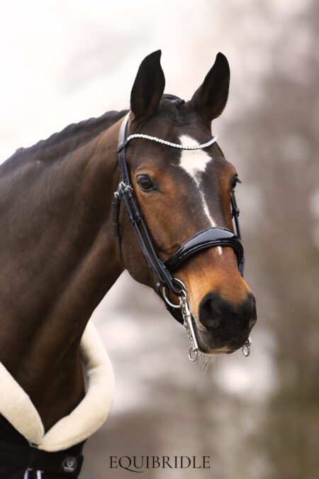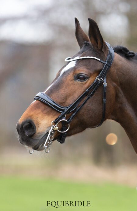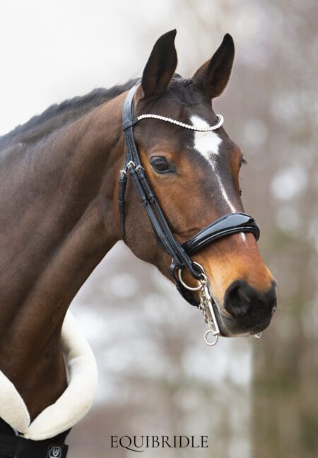 - Speciaal gevormde hoge lakneusriem. Deze neusriem is speciaal ontworpen om de jukbeenderen mooi vrij te houden en ruimte voor het bit te creëren terwijl ook de uittredende zenuwbundel boven de neusriem vrij gehouden wordt van druk.