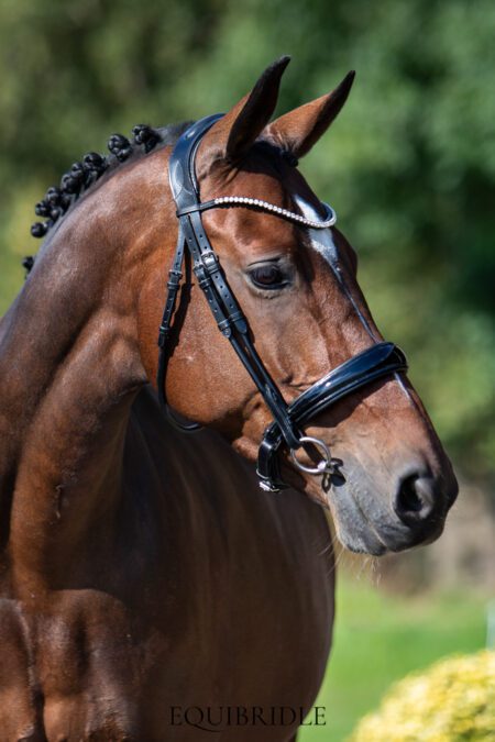 - Speciaal gevormde hoge neusriem, deze loopt taps toe zodat er ruimte is voor het bit en de uittredende zenuw boven de neusriem. De neusriem is onderlegd met super soft leder.