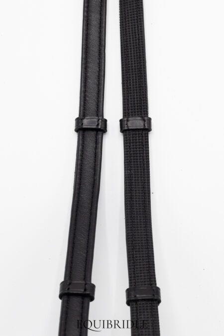 Zeer luxe set platte Italiaans lederen stang en trens teugels met extra grip op de trensteugel. Dit leer is zeer zacht en heeft een luxe uitstraling. Het leer heeft een prachtige glans en is afgewerkt met dunne stiksels.